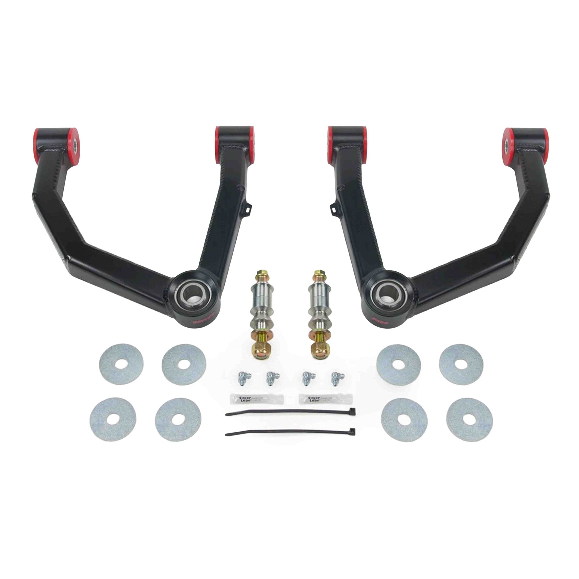 There are multiple issues when lifting your vehicle with stock upper control arms. Both the geometry and strength are compromised due to over articulating the stock arms. We solved these problems by designing our upper control arms with increased castor and repositioned pivot angles reducing stress on the joints. The increased castor allows for proper alignment and improved handling. We also replaced the weak factory ball joints with 1” stainless steel uniballs for maximum strength and increased articulation. For the inner pivots we use durable urethane bushings with grease fittings for easy servicing. To mount the arms to the spindle we include high grade 17-4 stainless steel misalignment spacers and military grade F911 hardware. All of the components on our upper control arms are rebuild-able or replaceable to make this product last a lifetime. The arms come preassembled and include detailed instructions for easy installation.
