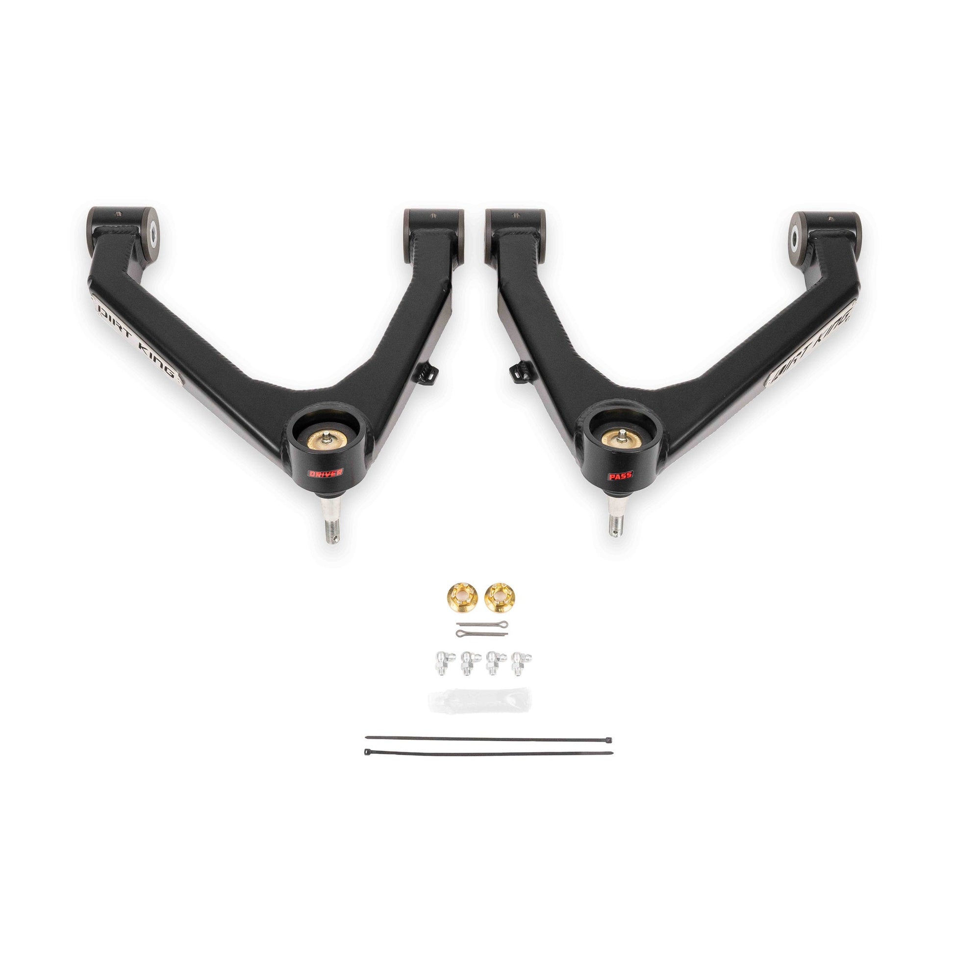 The Dirt King upper control arms must be paired with aftermarket coilover shocks to lift the vehicle. The Dirt King arms offer maximum down travel compared to the stock upper control arms. These arms are compatible with Dirt King, King, Fox, Bilstein, ADS and Icon coilovers. Do not install these upper control arms with coil spacers paired with extended length aftermarket shocks.