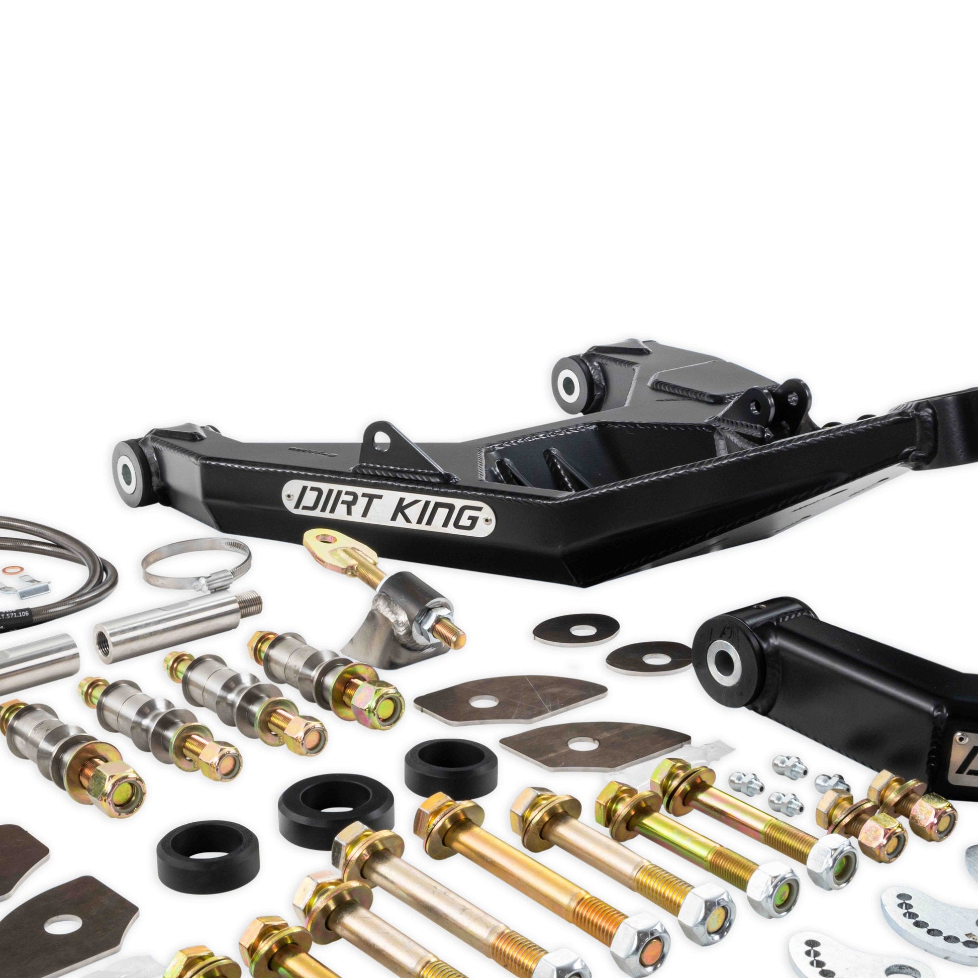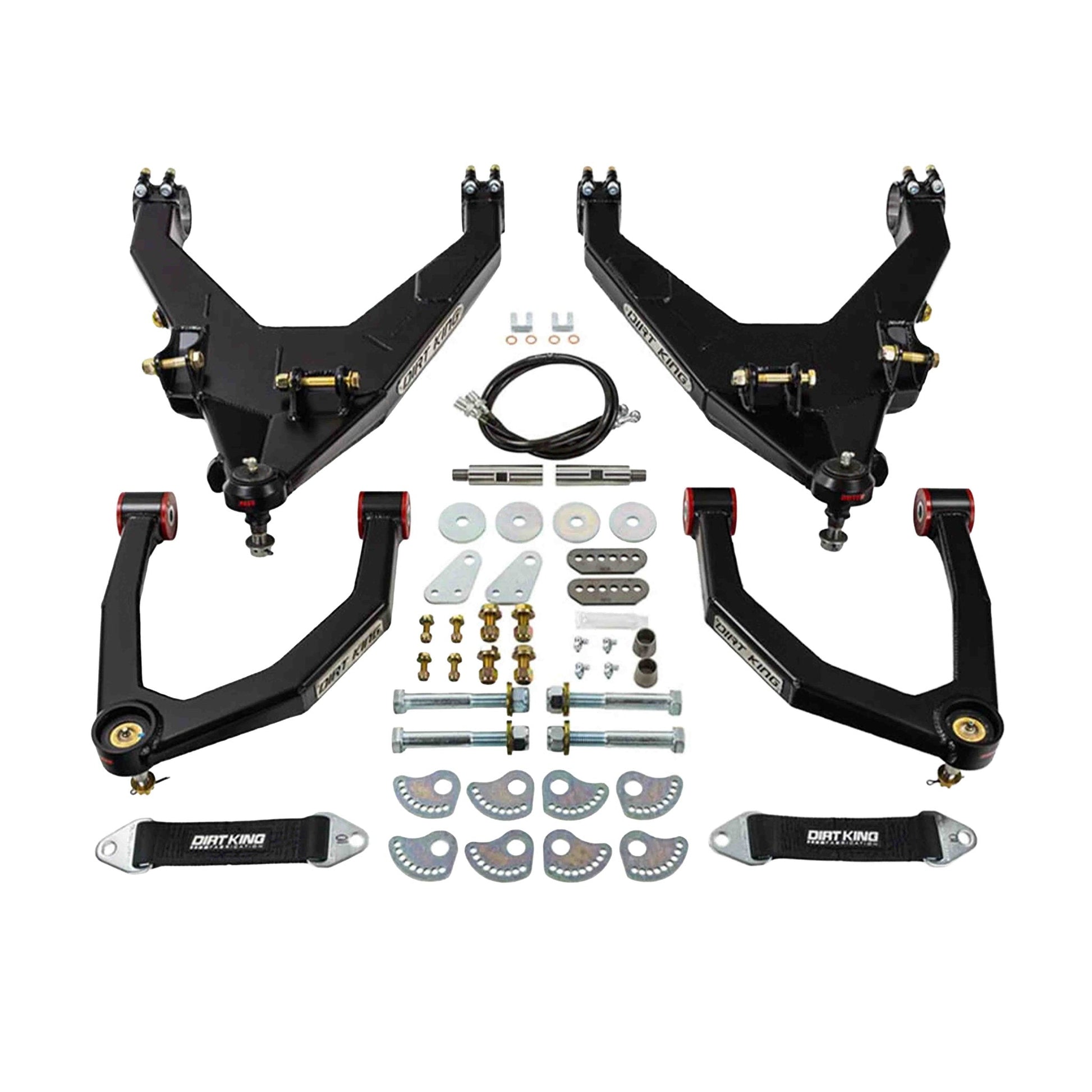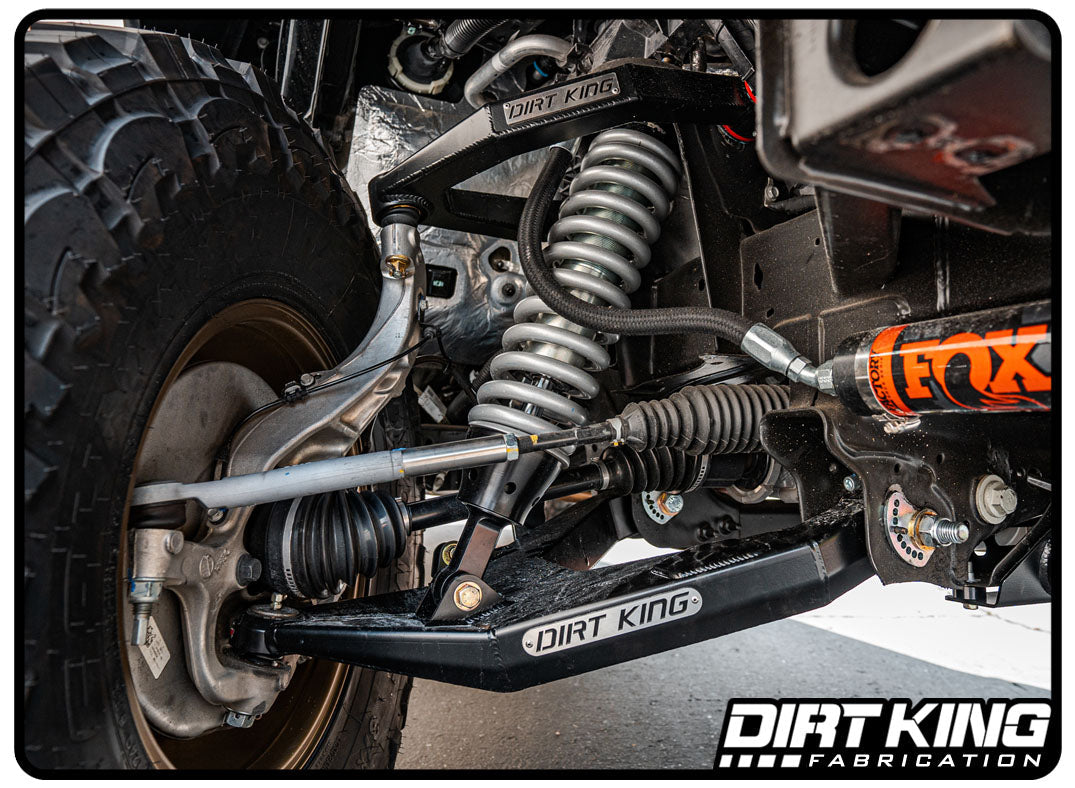 The Dirt King long travel kit was developed to drastically improve the vehicles off-road handling without compromising its day to day driving characteristics. This suspension system allows for 13” of travel and accepts up to 37” tires. The kit is compatible with 2WD models and 4WD models along with the purchase of extended axle shafts. Our upper and lower arms are designed with heavy duty Moog ball joints which are low maintenance and easily serviceable. The lower arms are tabbed to accommodate for coilovers, bypasses, bump stops, and limit straps. They also utilize the factory inner bushings for a factory like feel on road while still allowing for enough articulation off-road. Another unique feature only found on our kit is progressive steering stops to limit the steering angle throughout the suspension cycle. This prevents premature wear on the CVs and tie rods at full compression or full extension. This kit is CAD designed, thoroughly tested, and made in America resulting in a product we’re proud to put our name on!