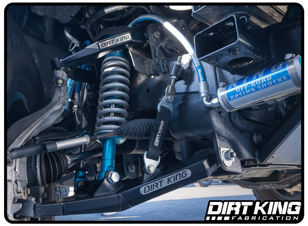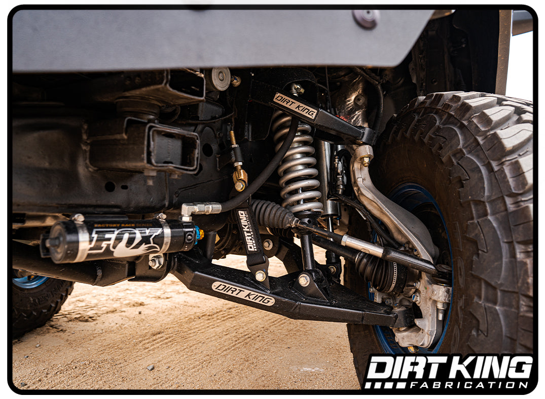 The Dirt King long travel kit was developed to drastically improve the vehicles off-road handling without compromising its day to day driving characteristics. This suspension system allows for 12” of travel and accepts up to a 37” tire. The kit is compatible with 2WD models and 4WD models along with the purchase of extended axle shafts. Our upper and lower arms are designed with 1” stainless steel uniballs for the outer pivots instead of ball joints for strength and increased articulation. The suspension system allows for bypass shocks to be added or can adapt to the factory sway bar. This kit is CAD designed, thoroughly tested, and 100% made in America resulting in a product we’re proud to put our name on!