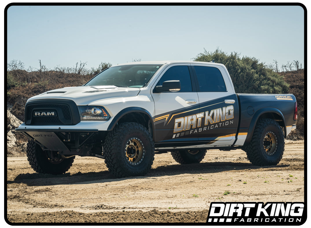 The Dirt King long travel kit was developed to drastically improve the vehicles off-road handling without compromising its day to day driving characteristics. This suspension system allows for 13.5” of travel and accepts up to a 37” tire. The kit is compatible with 2WD models and 4WD models along with the purchase of extended axle shafts. Our upper and lower arms are designed with 1” stainless steel uniballs for the outer pivots instead of ball joints for strength and increased articulation. This kit is the first of its kind, it’s a complete bolt on application with no cutting or welding to the frame on 4WD models. The suspension system was originally developed for Ram Trucks new concept vehicle, the Ram Rebel TRX which was released in mid-2016. After its amazing performance we decided to put the kit in production and make it available to the public!