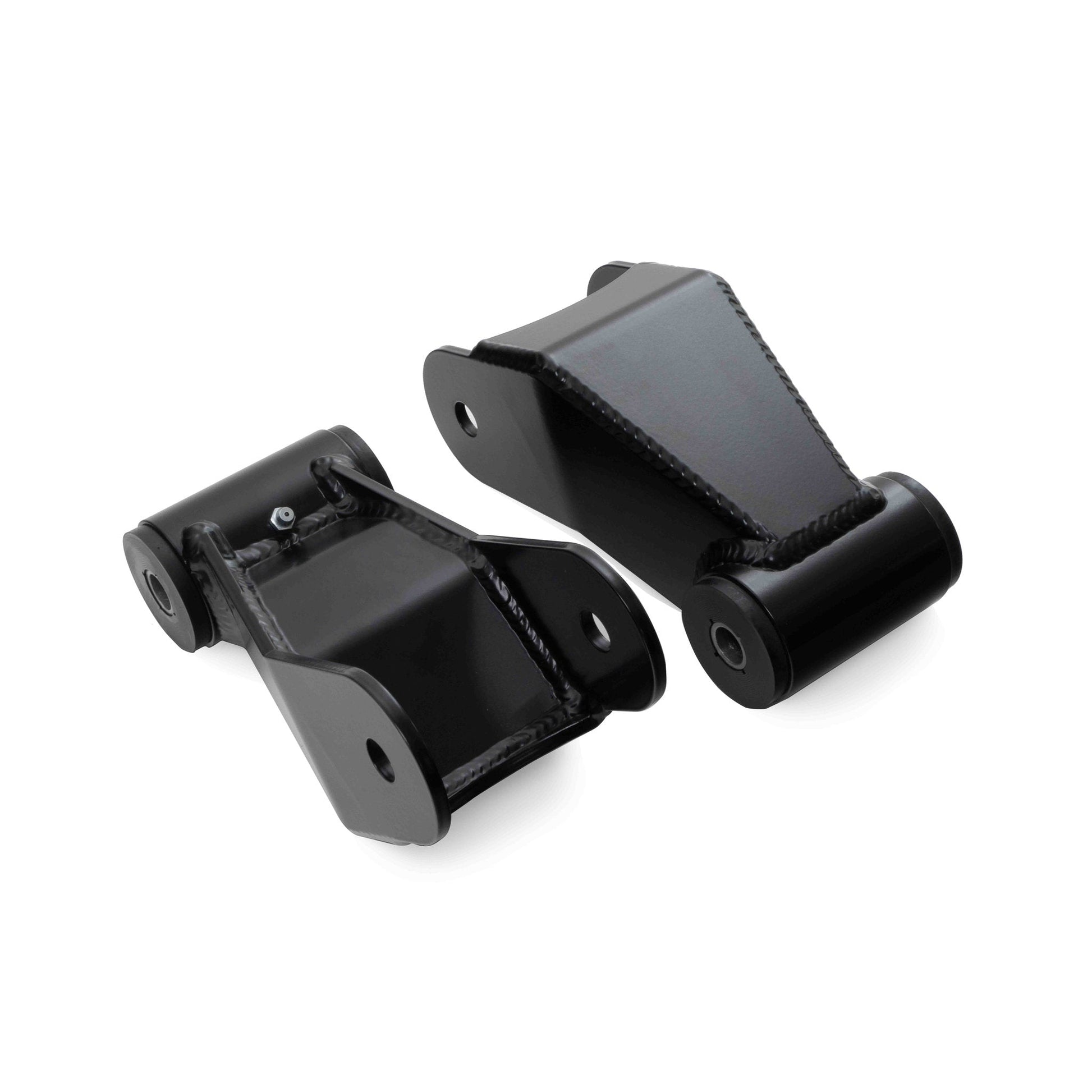 The Dirt King long travel shackles allow for additional down travel when paired with long travel leaf springs and are much stronger compared to the factory shackles. They are CAD designed and constructed using 3/16" thick steel. The shackles drop the rear ride height to help level the vehicle. They also have grease ports to easily service the bushings.