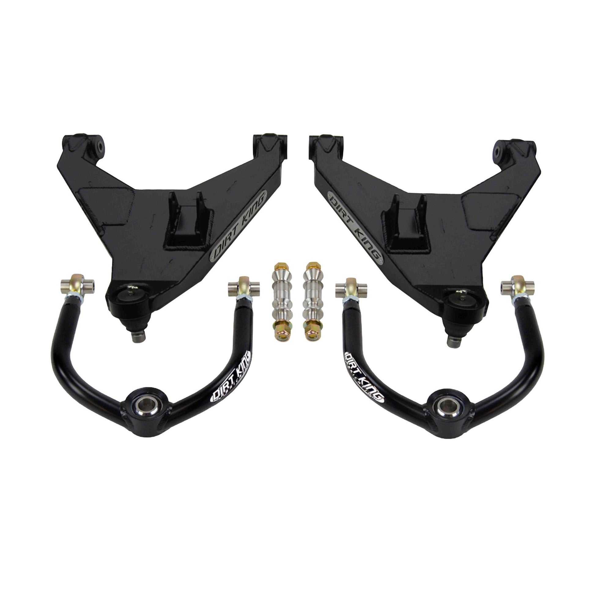 The Dirt King mid travel kit was developed to drastically improve the vehicles off-road handling without compromising its day to day driving characteristics. This suspension system allows for 10.5” of travel and accepts up to a 35” tire. The kit is compatible with 2WD and 4WD models. We’ve upgraded the lower arm outer pivot to heavy duty Moog ball joints and 1” uniballs for the upper arm outer pivot. This allows for superior strength and increased articulation. The suspension system also accommodates for bump stops to be used with the coil overs if desired. This kit is CAD designed, thoroughly tested, and 100% made in America resulting in a product we’re proud to put our name on!