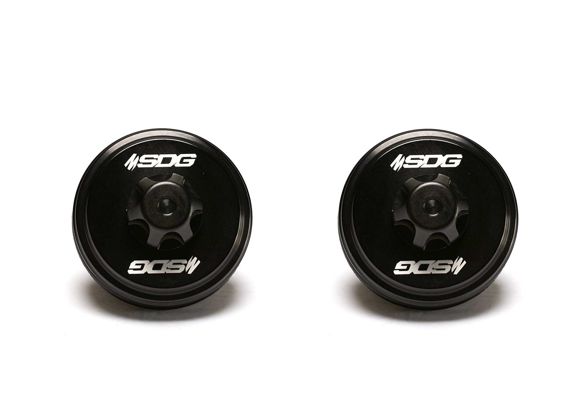These reservoir end caps are made from 6061 billet aluminum and have been black anodized then engraved with our SDG logo. These end caps have an o-ring based "schrader valve cap" which threads onto the schrader valve and seals it into the recessed pocket. This fully protects it from dirt, debris, mud, or sand. Our SDG replacement end caps also come with a new o-ring for re-installing the replacement end cap back into the shock reservoir.