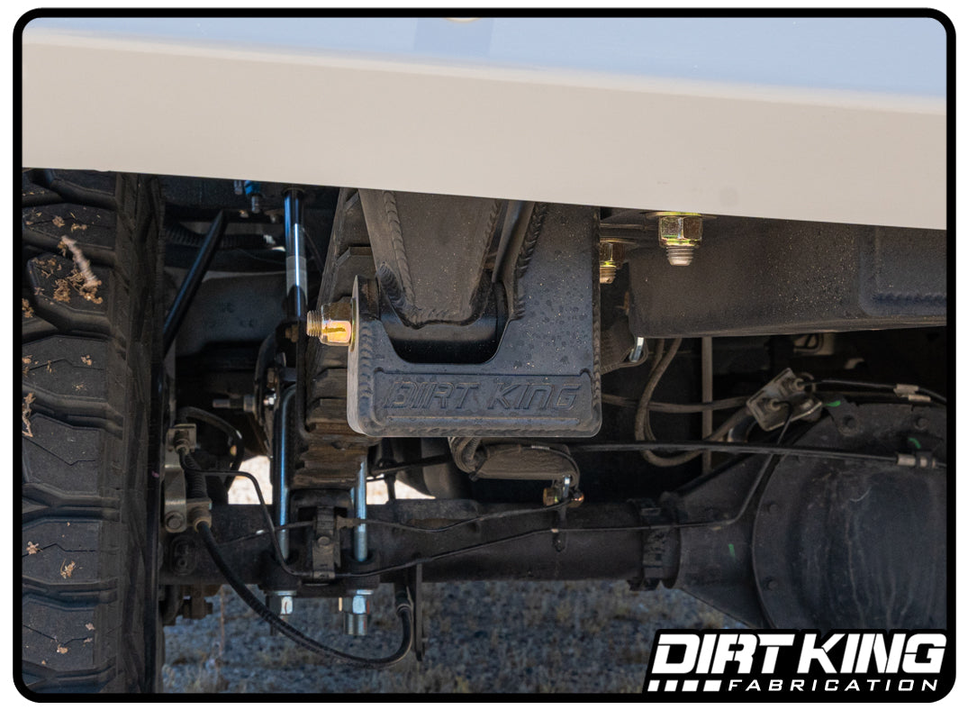 The Dirt King shackle and hanger kit is designed for increased strength and improved rear suspension performance. The kit moves the shackle hanger’s location to correct the geometry of the leaf springs. The shackles are also extended to allow for additional travel when paired with long travel leaf springs. The entire kit is CAD designed and built to withstand much more abuse than the factory components.
