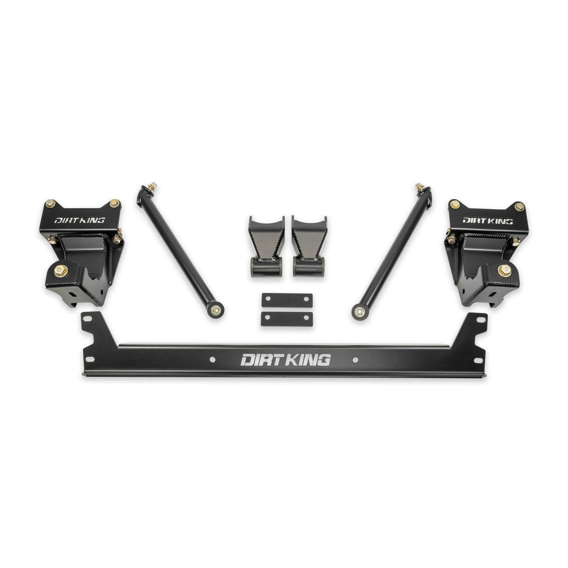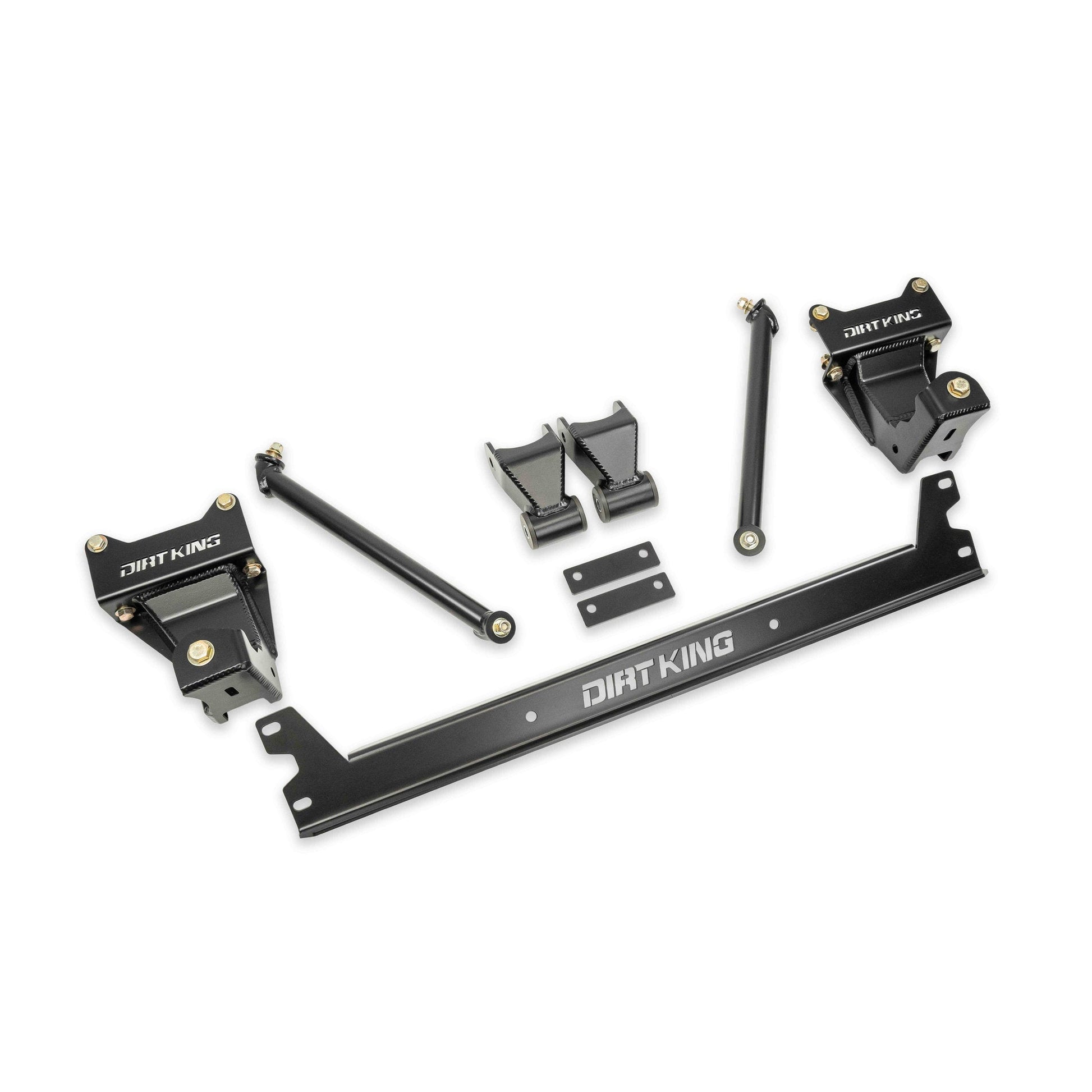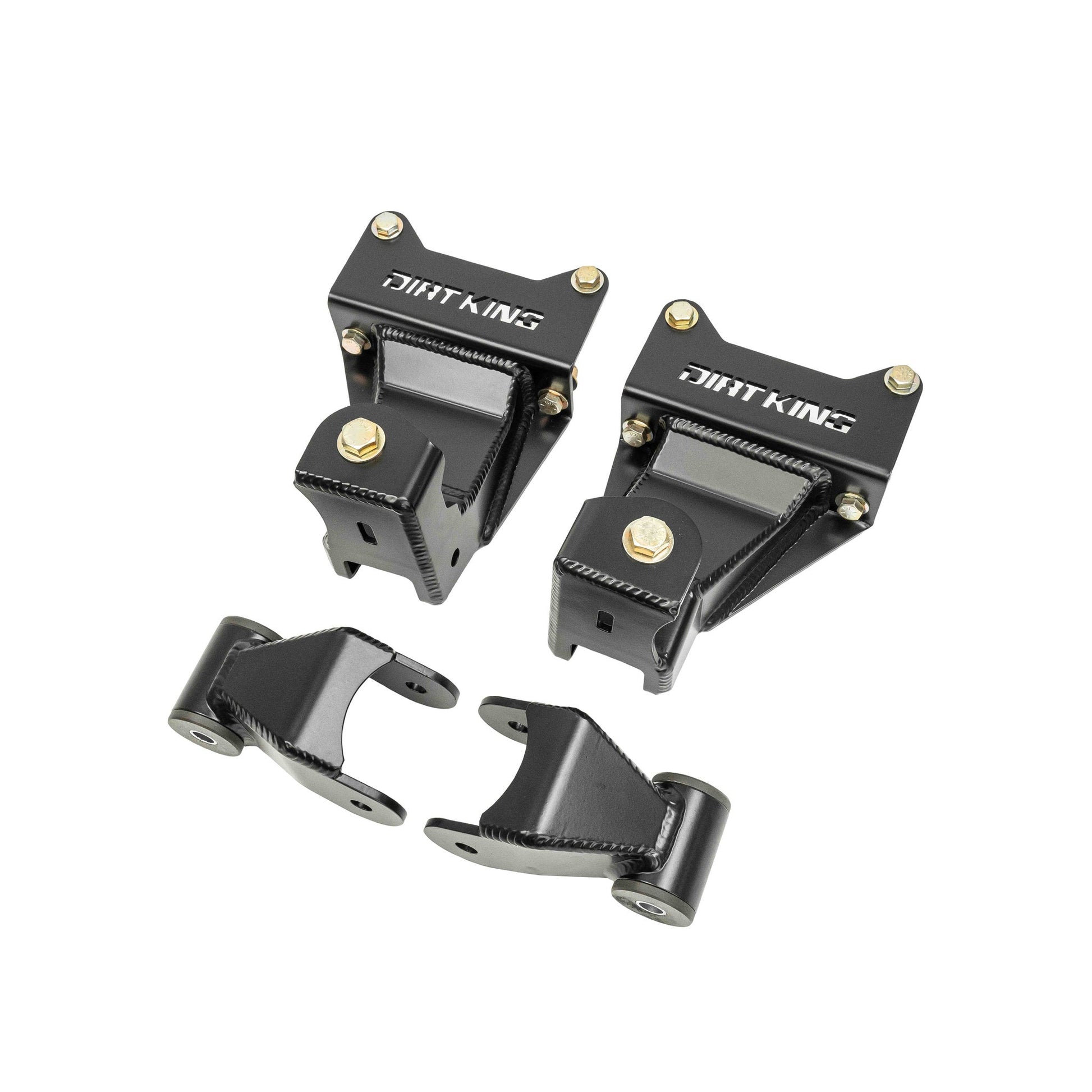 Upgrade your 2005-2023 Toyota Tacoma with the Dirt King heavy-duty shackle and hanger kit, designed to significantly improve geometry and strength. Constructed from high strength 3/16" and 1/4" steel, these shackles and hangers are engineered to resist deflection and bending, a common issue with stock shackle hangers. The redesigned mounting location and length of the shackle improves articulation and droop travel for superior off-road performance. When paired with Deaver U402 leaf springs, shock relocation towers, and 12" shocks you can achieve 13" of travel, a remarkable 30% improvement over the factory setup. This kit is compatible with all OEM replacement leaf springs. The hangers are easily installed using grade 8 mounting hardware. For those seeking even greater strength, an optional cross brace is available. This brace is compatible with the OEM spare tire & the factory tow hitch, although compatibility with certain aftermarket rear bumpers may vary.